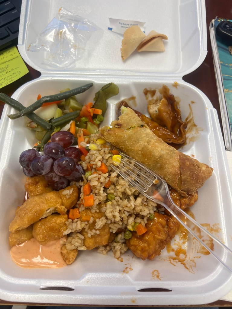 “Do you want some of both?” the server asked me, as she dished out a generous helping of each flavor of chicken in my box, and then she plucked the lone egg roll from its spot, nestling it sideways against the chicken. It was mine, all mine, and I treasured the thought of eating it as I scooped my own servings of rice, vegetables, and fruit.