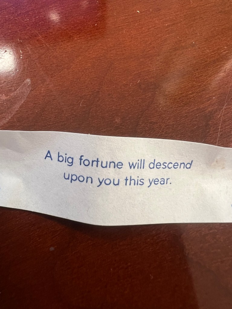 The slip inside my fortune cookie read, “A big fortune will descend upon you this year.”
