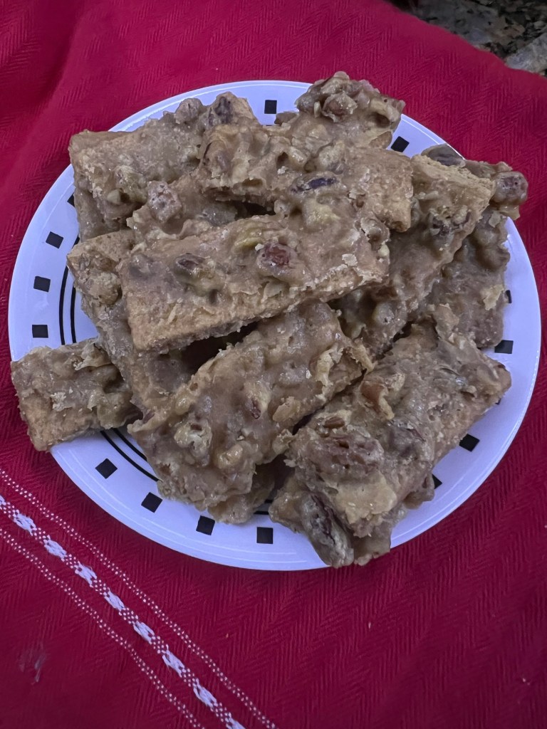 The saucepan concoction has started bubbling, so you stir, stir, stir for three minutes and then dump it on your crackers and cuss, cuss, cuss because it’s setting up too quickly. The pecans and toffee mixture are clumping rather than spreading.