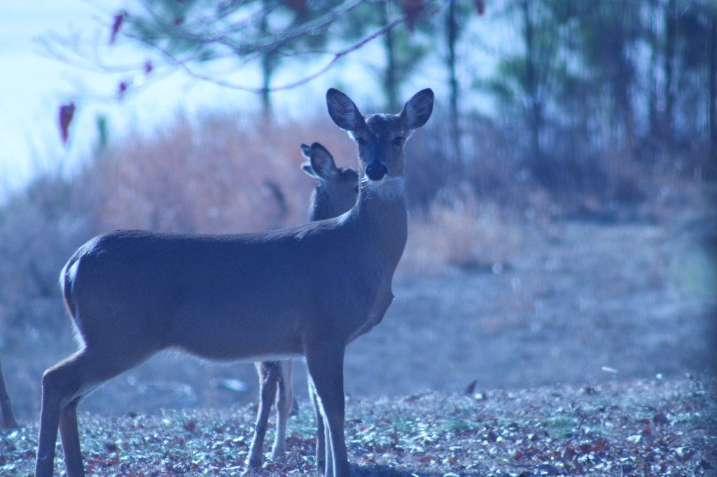 But this morning I found myself watching again, peering out the window. The sun had risen above the trees, illuminating the icy sheet that covered most of the pond. Birds were in the trees, per the usual, but what did I see in the yard?