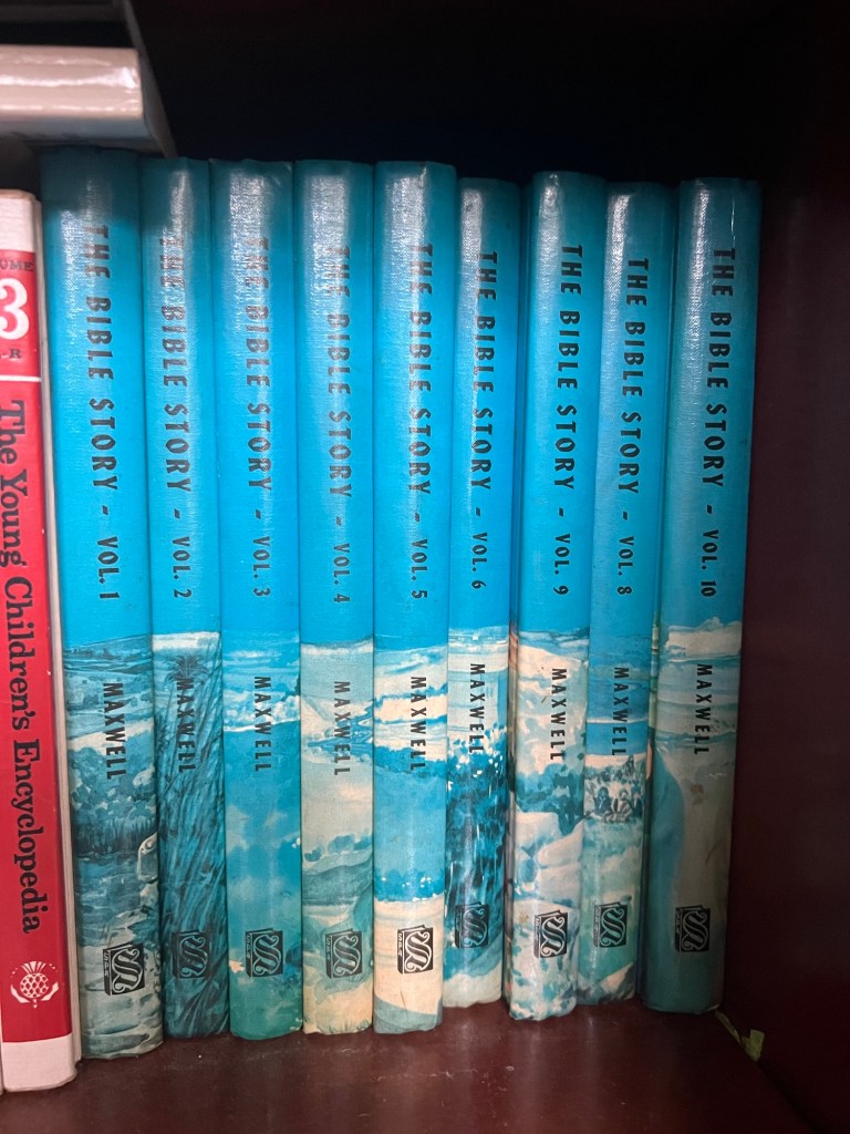 The mind part was just as important as the rest, for Nanny also had an entire library of religious texts and commentaries that she studied. My favorite was the ten-volume set of that famous children’s Bible anthology, The Bible Story. The books’ spines—bright turquoise on the top half, earth tones on the lower—took up a chunk of space on the bottom bookshelf at her house. I spent untold hours enjoying the stories, especially through the vibrant illustrations.