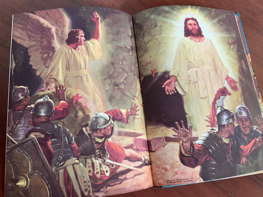 I loved them all, but the greatest one to which everything else seemed to point, even in my child’s mind, was the story of Jesus. The miracles He performed were more than just make-believe stories. Feeding the 5000 from just five loaves and two fish, healing the blind and the sick, and bringing Lazarus back to life all culminated in the scariest part—Jesus was arrested, beaten, and then killed, in the most horrible of ways. Dark gray clouds colored the pages depicting the crucifixion of Jesus, but there was hope! For on the next pages, the stone had been rolled away from the tomb, and there He was—alive again!